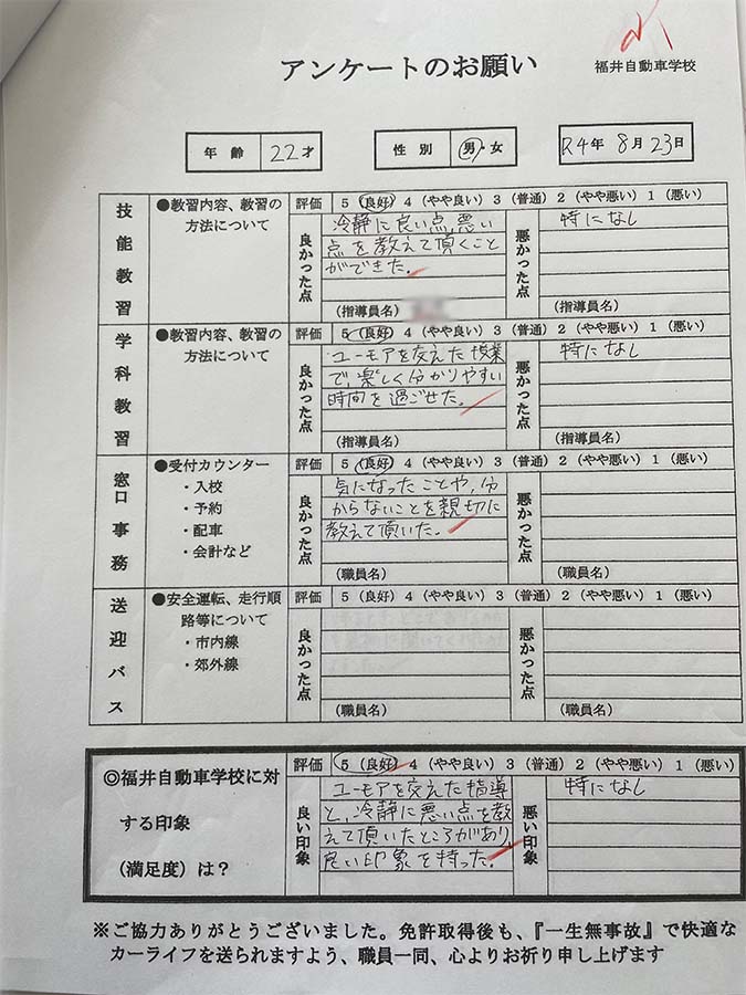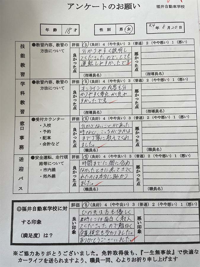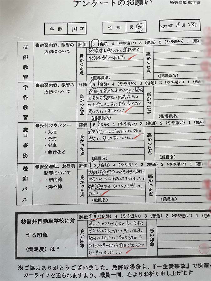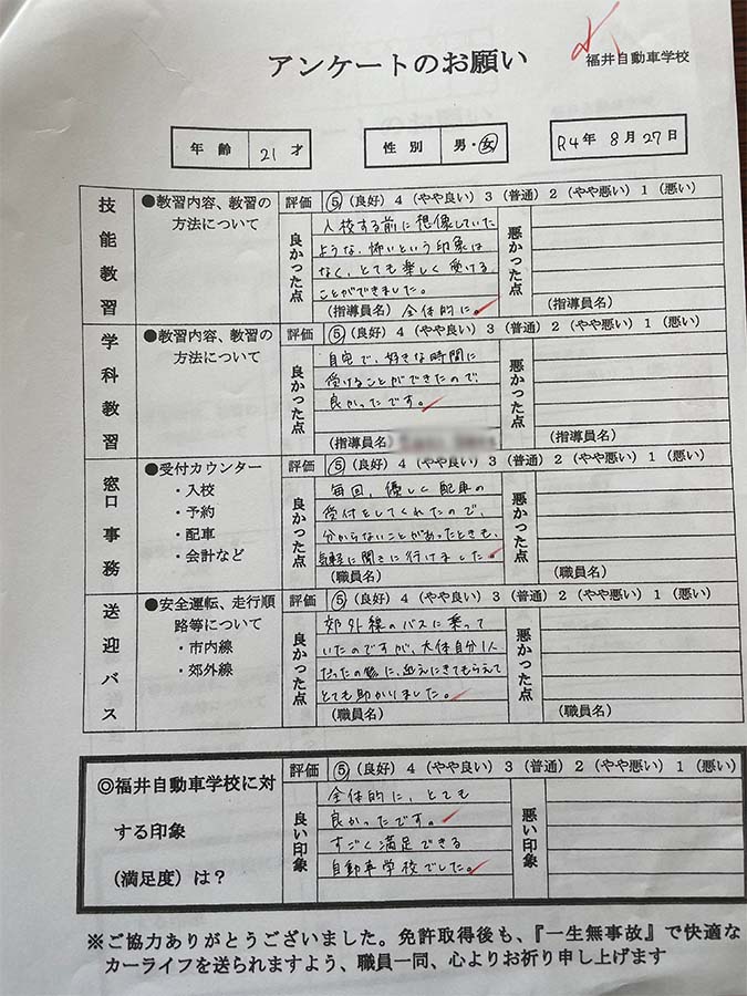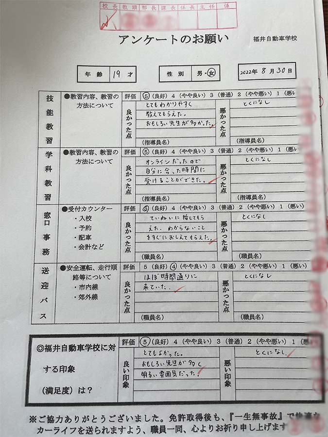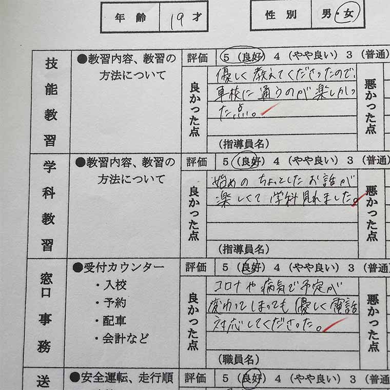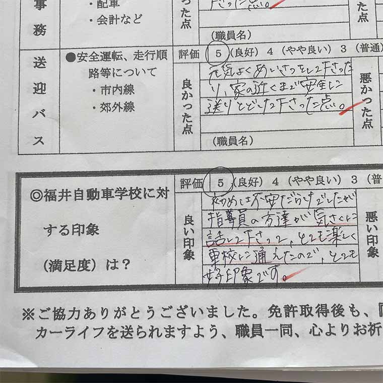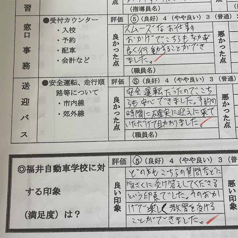 ふくじは、普通車・準中型車の卒業生を対象として、アンケートにご協力いただいております。