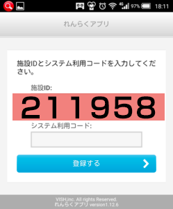 インストールした「れんらくアプリ」を起動し、施設ID211958を入力し、「登録する」ボタンをタップしてください。